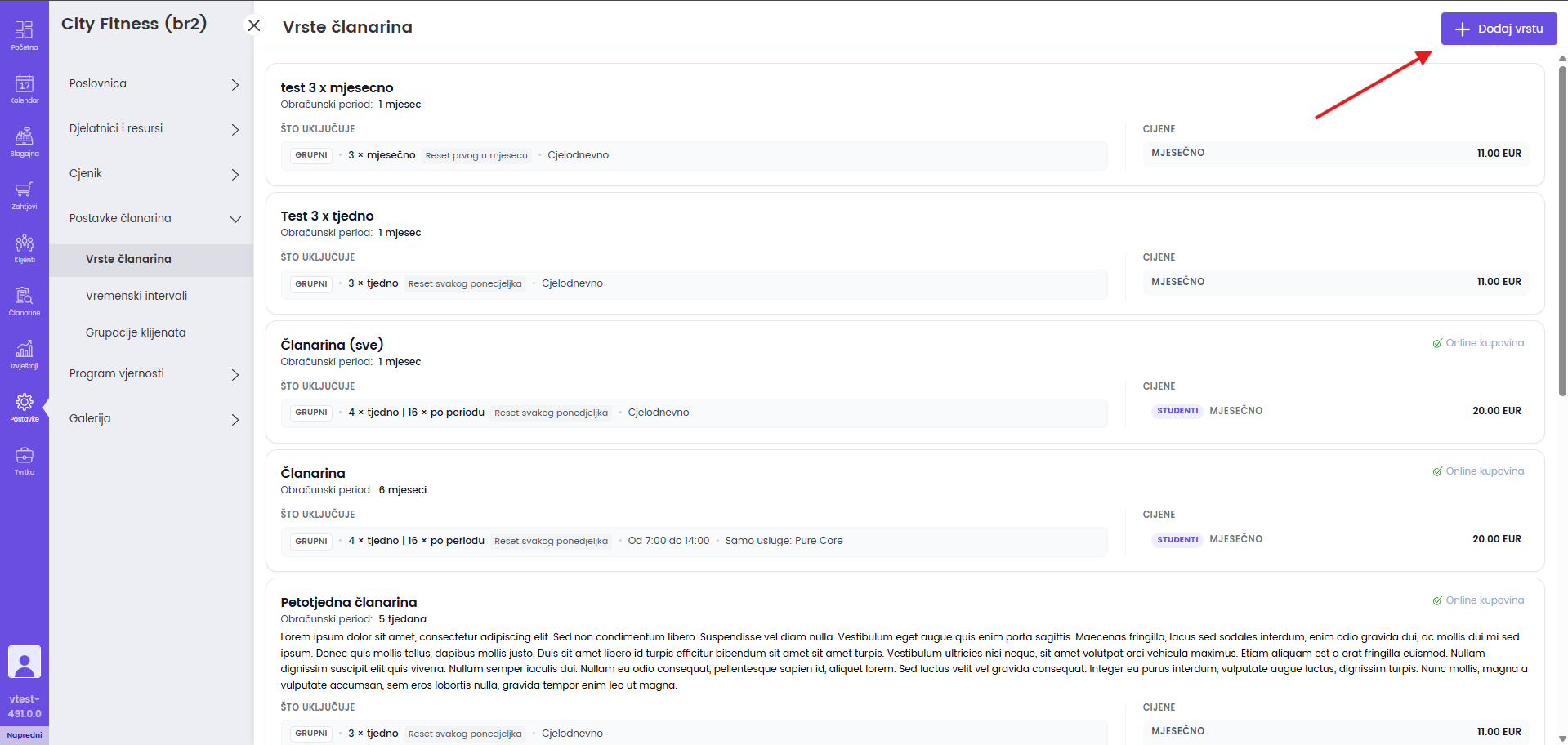 Dodavanje vrste članarine