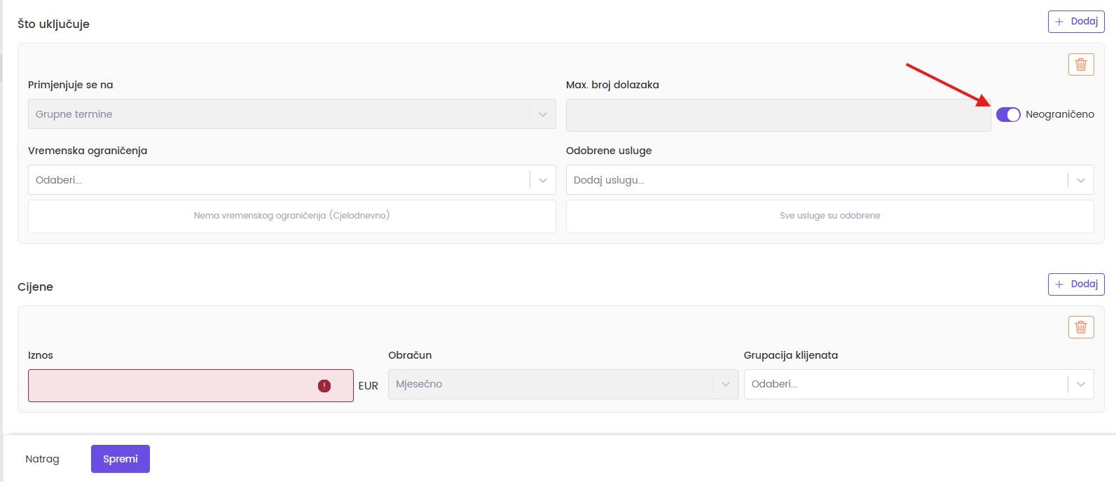 Stavka "Primjenjuje se na" je fiksna – članarina vrijedi za grupne termine.