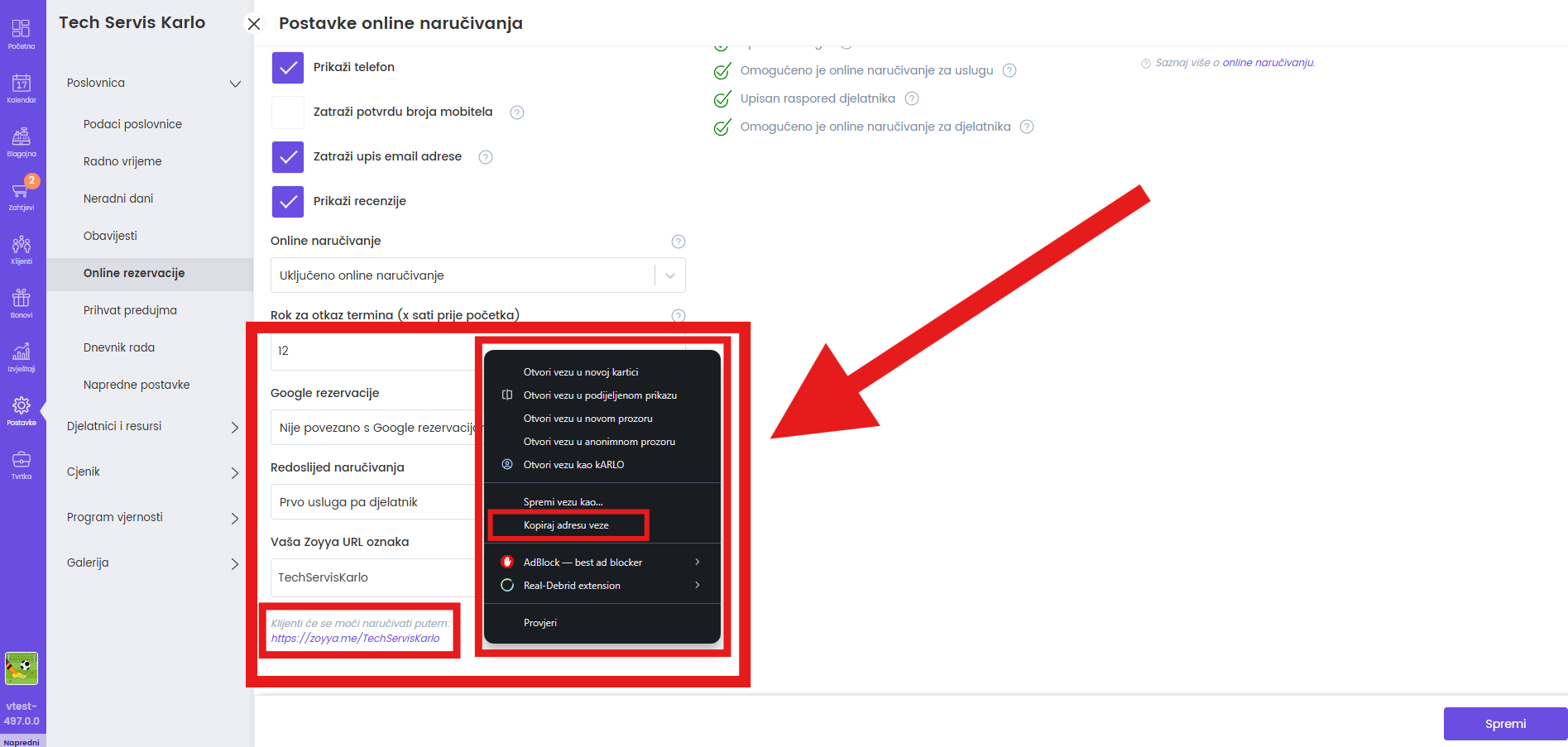 Kliknite "Postavke". U izborniku odaberite "Online rezervacije". Na ekranu potražite tekst "Klijenti će se moći naručivati putem:". Odmah uz taj tekst prikazan je vaš link profila. Pritisnite link desnim klikom miša i pritisnite "Kopiraj adresu veze".