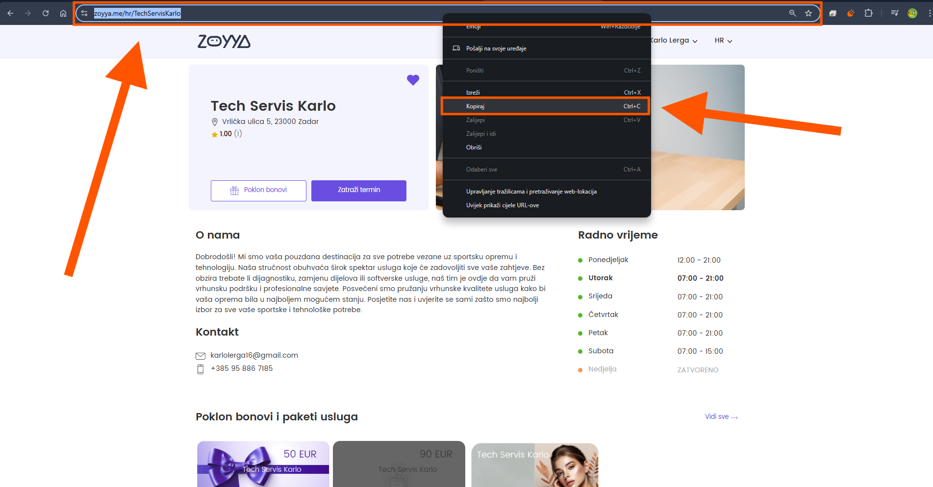 Otvorite stranicu Zoyya.com u pregledniku. Potražite svoju poslovnicu i otvorite profil. U adresnoj traci pritisnite link desnim klikom miša i pritisnite "Kopiraj".