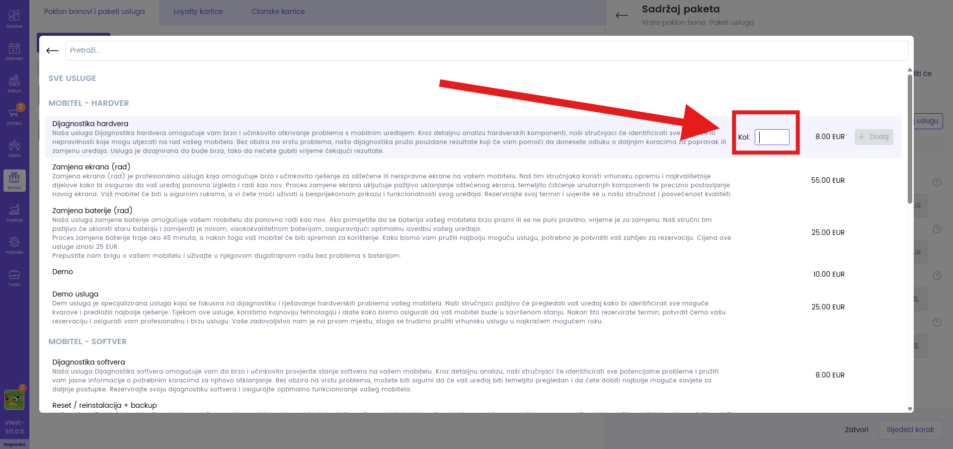 Nakon toga odaberite usluge koje ulaze u paket, kao i količinu usluga koje paket pokriva.