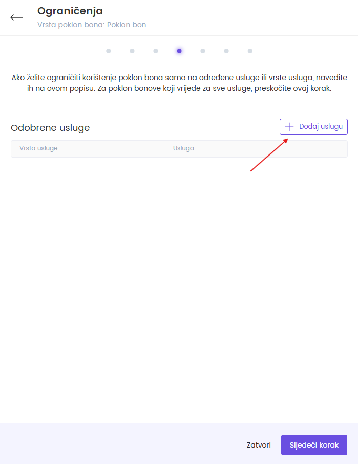 Kliknite "Dodaj uslugu" i odaberite vrste i konkretne usluge.
