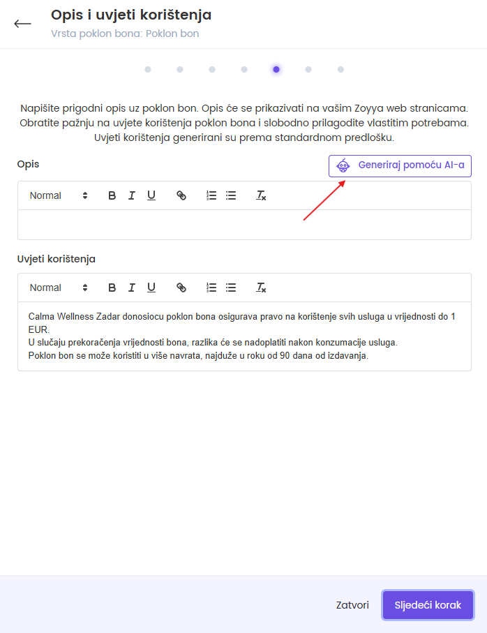 U koraku Opis i uvjeti korištenja upišite kratak opis poklon bona.