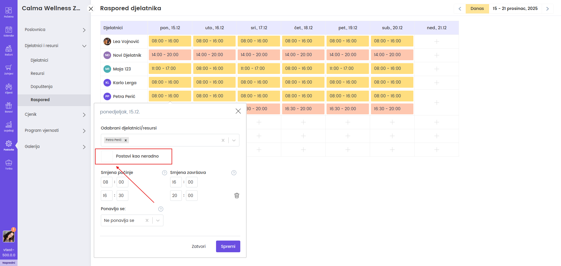 Kako biste obrisali raspored, potrebno je otvoriti određeni dan i označiti "Postavi kao neradno".