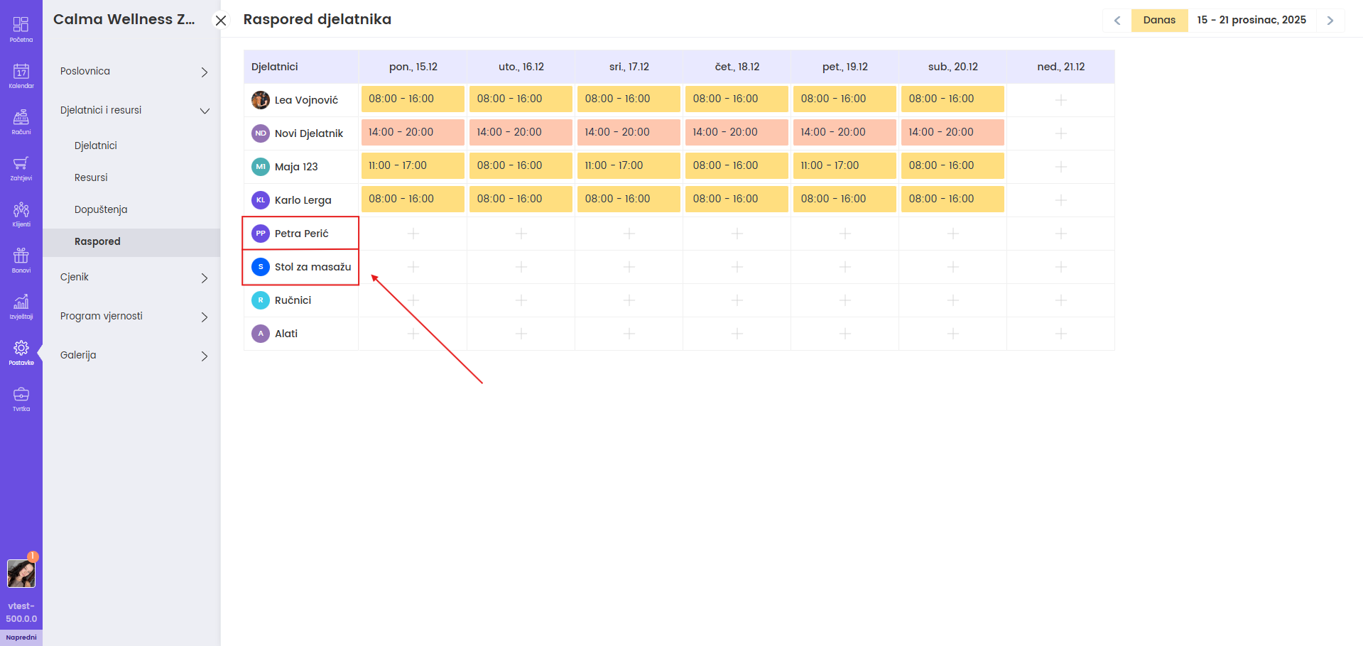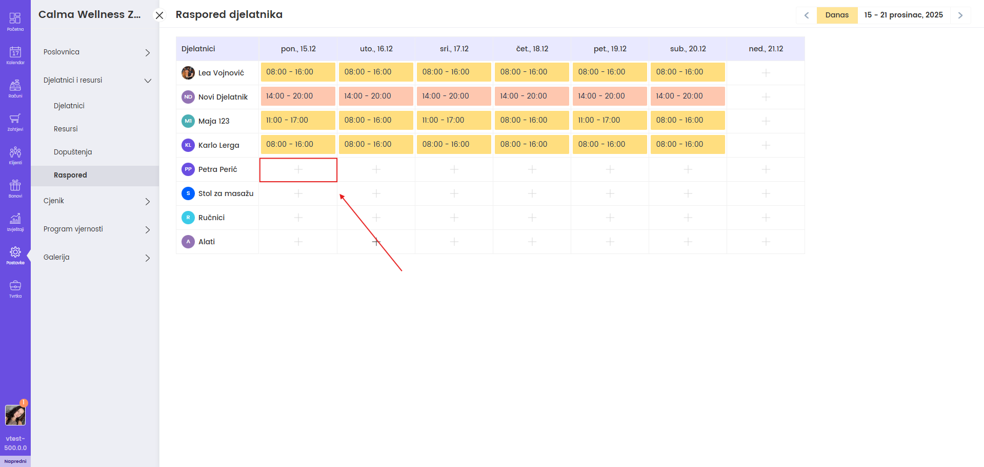 Kliknite na "+" u polju dana za željenog djelatnika ili za resurs.