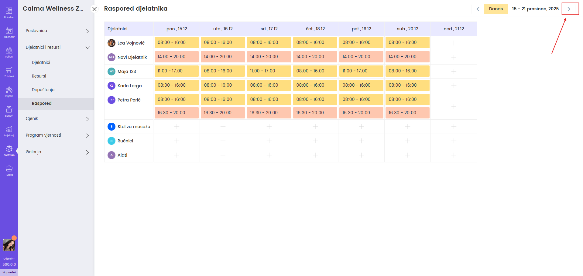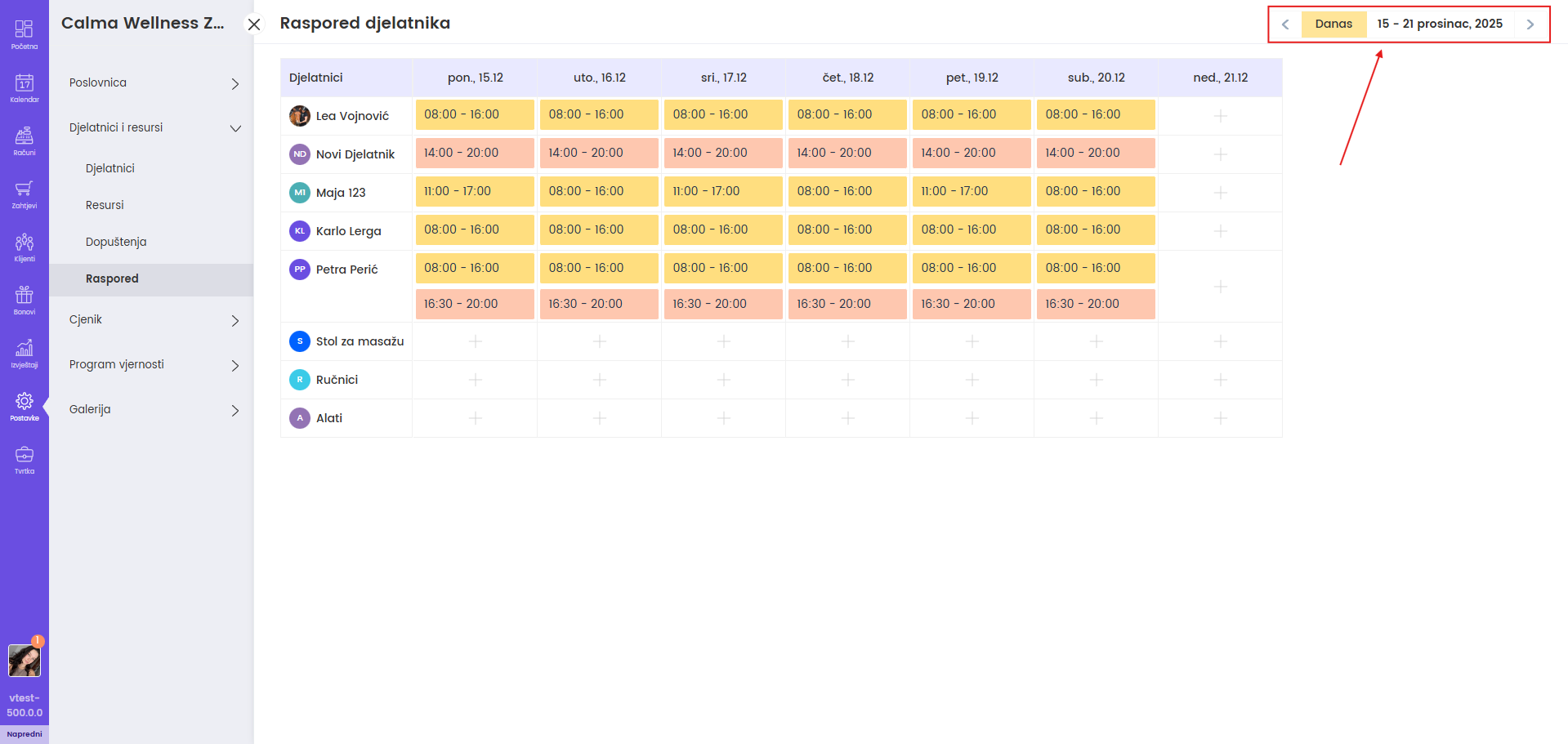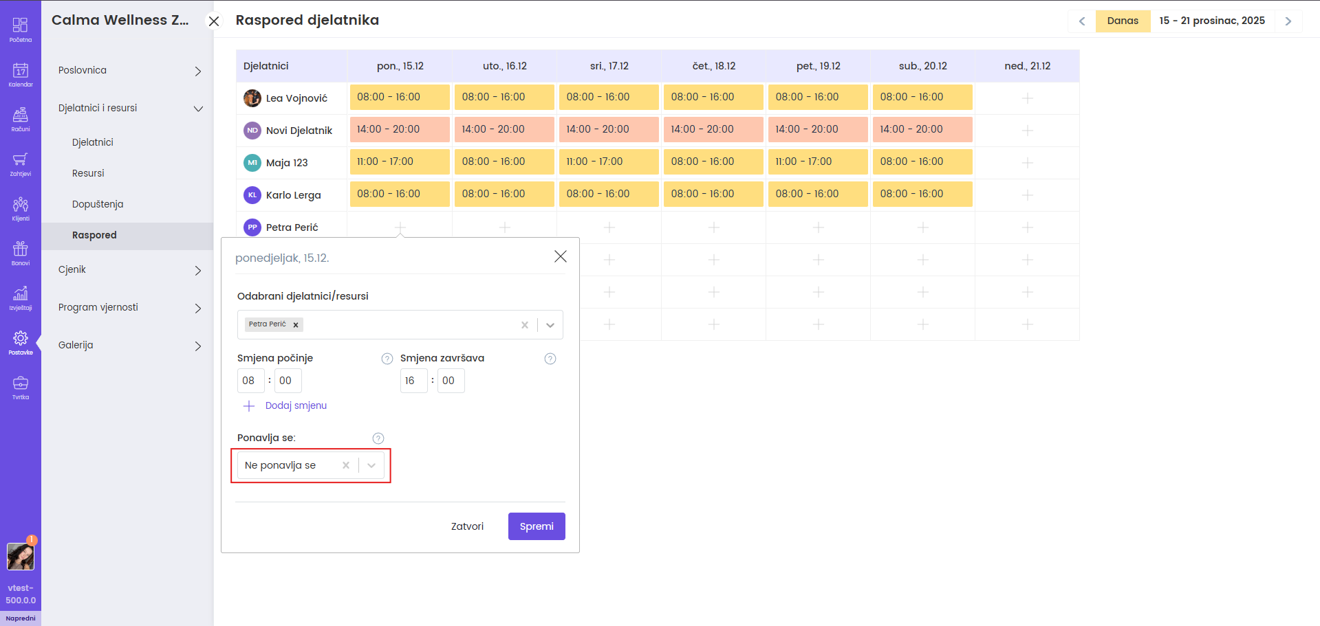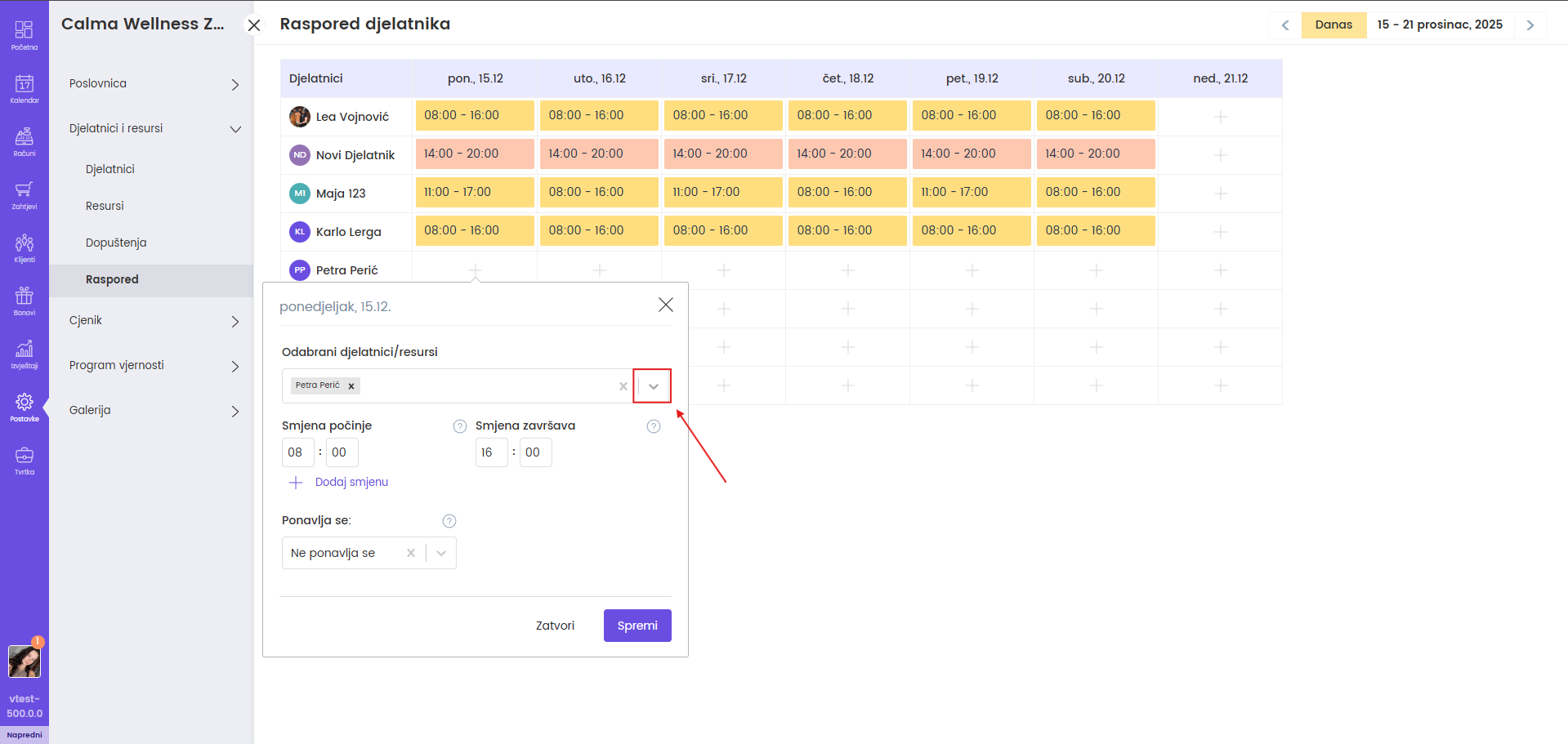 Ako koristite resurse ili opremu npr. soba, aparat i slično, u "Odabrani djelatnici/resursi" dodajte i taj resurs te upišite smjene jednako kao i za djelatnika.